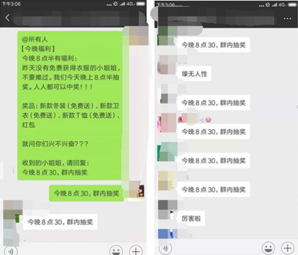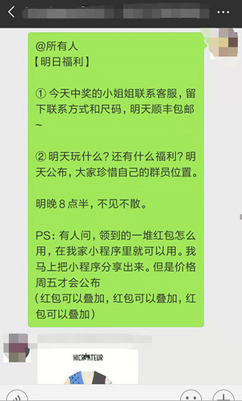 福利:從第一天開始,每天晚上活動(dòng)都會抽獎(jiǎng)(送衣服)。這個(gè)看起來有點(diǎn)粗暴,但是別擔(dān)心,服裝的利潤普遍較高,送衣服,相當(dāng)于我們做市場費(fèi)用投入了。所以這小幾千的成本完全可以通過銷售額回收。也恰恰就是這么粗暴活動(dòng),大家晚上8點(diǎn)半準(zhǔn)時(shí)在社群里等著。