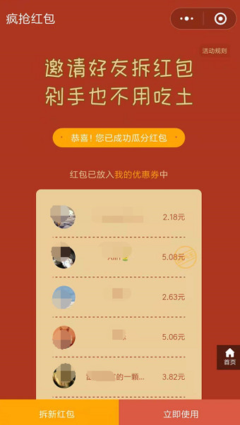 1. 想要大家多領(lǐng)一些紅包,紅包可以疊加使用,但是又不能讓大家覺得我們的品牌廉價(jià)。我們是通過小程序自帶的拆紅包功能來實(shí)現(xiàn)的;