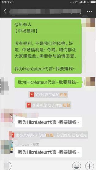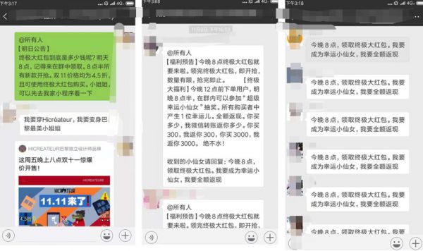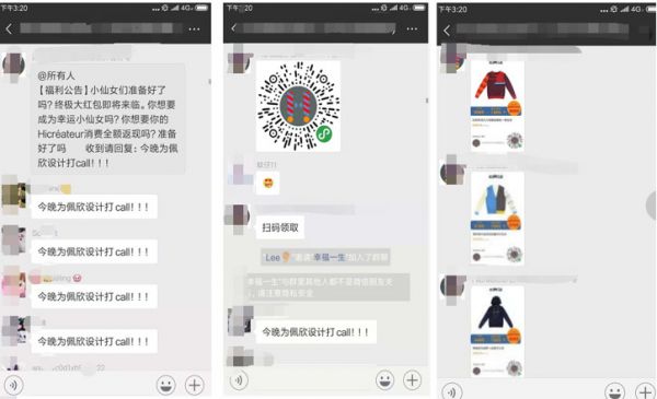 2. 活動(dòng)開始:活動(dòng)開始后,我們發(fā)了一個(gè)群公告,然后又讓大家刷屏一波。制造一下氣氛,然后發(fā)出一個(gè)終極紅包領(lǐng)取的二維碼,讓大家掃碼領(lǐng)取。緊接著把雙11款的衣服一張一張發(fā)出來。