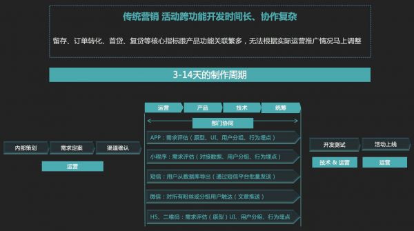 不管是不是消金產(chǎn)品,一般做常規(guī)的活動(dòng)營(yíng)銷是確定了運(yùn)營(yíng)方案,然后找研發(fā)甚至找上產(chǎn)品經(jīng)理去評(píng)估實(shí)現(xiàn)難度與排期,可能折騰一個(gè)月過(guò)去之后,終于上線了活動(dòng),然后一旦活動(dòng)效果不理想也只能留待復(fù)盤的時(shí)候,再來(lái)想優(yōu)化下次再執(zhí)行。我們來(lái)看下圖,基本呈現(xiàn)了現(xiàn)在大部分運(yùn)營(yíng)流程與效率的情況。