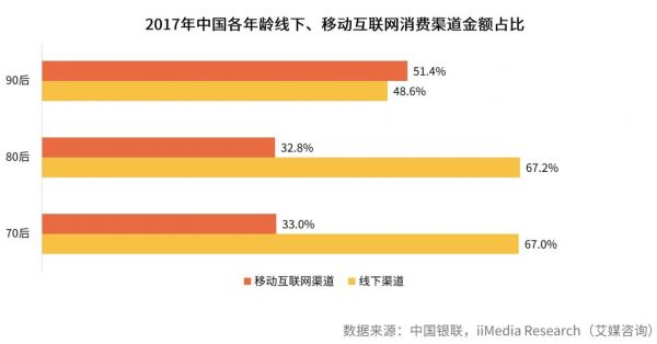 我們先來(lái)看一組17年線下、移動(dòng)互聯(lián)網(wǎng)消費(fèi)渠道金額占比數(shù)據(jù),可以很明顯地看到90后線下渠道消費(fèi)金額的占比不高,但具有很大的上升潛力。