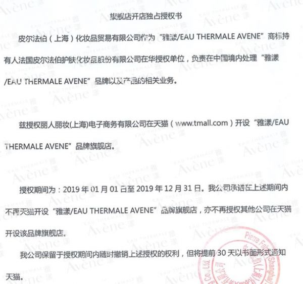 以雅漾為例,其天貓旗艦店中展示了《旗艦店開店獨占授權(quán)書》,雅漾品牌所有人皮爾法伯(上海)化妝品貿(mào)易有限公司獨家授權(quán)麗人麗妝在天貓開設(shè)“雅漾”品牌旗艦店,授權(quán)期為2019年1月1日至2019年12月31日。