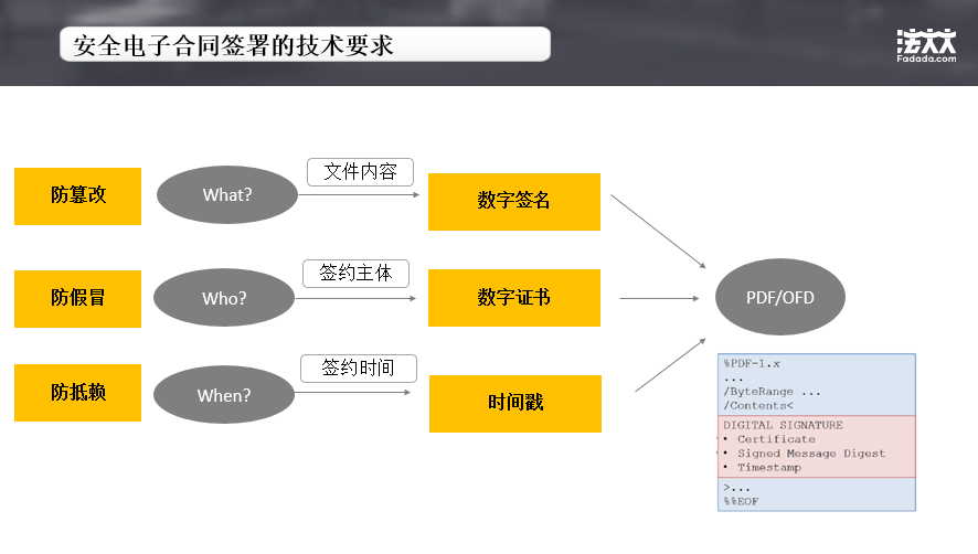 電子合同簽署技術(shù)要求,概括來(lái)說(shuō)就是3W,我們會(huì)對(duì)文件內(nèi)容、簽約主體和簽約時(shí)間,分別通過(guò)數(shù)字簽名,數(shù)字證書(shū)和可信時(shí)間戳來(lái)進(jìn)行運(yùn)算,最終植入到電子合同中,電子合同最終承載的實(shí)體在我們國(guó)內(nèi)更多使用OFD格式,整個(gè)國(guó)際上通用的是PDF,我們會(huì)把這些數(shù)據(jù)格式寫(xiě)入到整個(gè)電子合同中去。