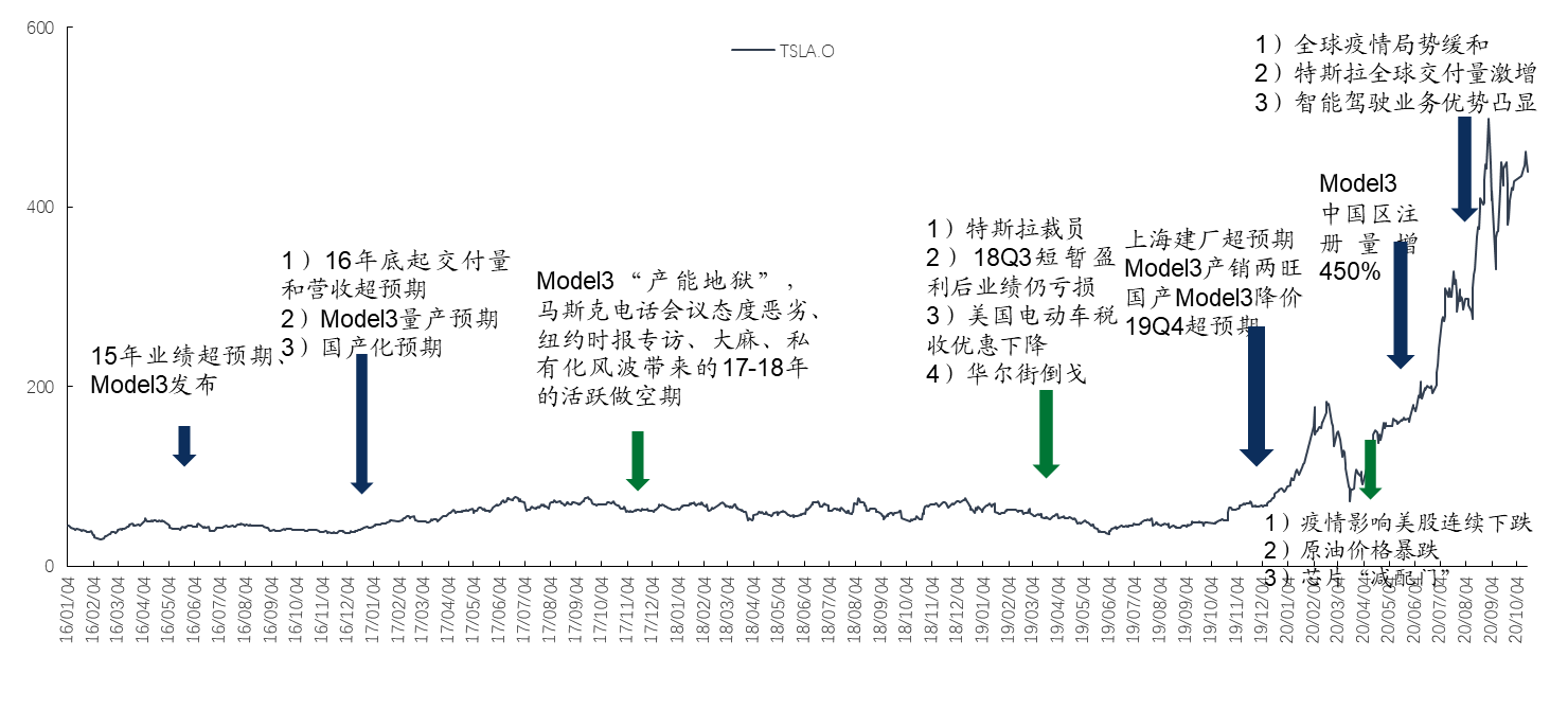 時間線拉回到03年,03年特斯拉成立,08發(fā)布了第一款兩門運動型跑車Roadster,但是一路摸索直到15年model3發(fā)布業(yè)績才稍有起色,在經(jīng)過漫長的認知塑造期,直到19年才進入盈利+產(chǎn)銷旺雙重利好,到了20年由于疫情全球交付量激增。