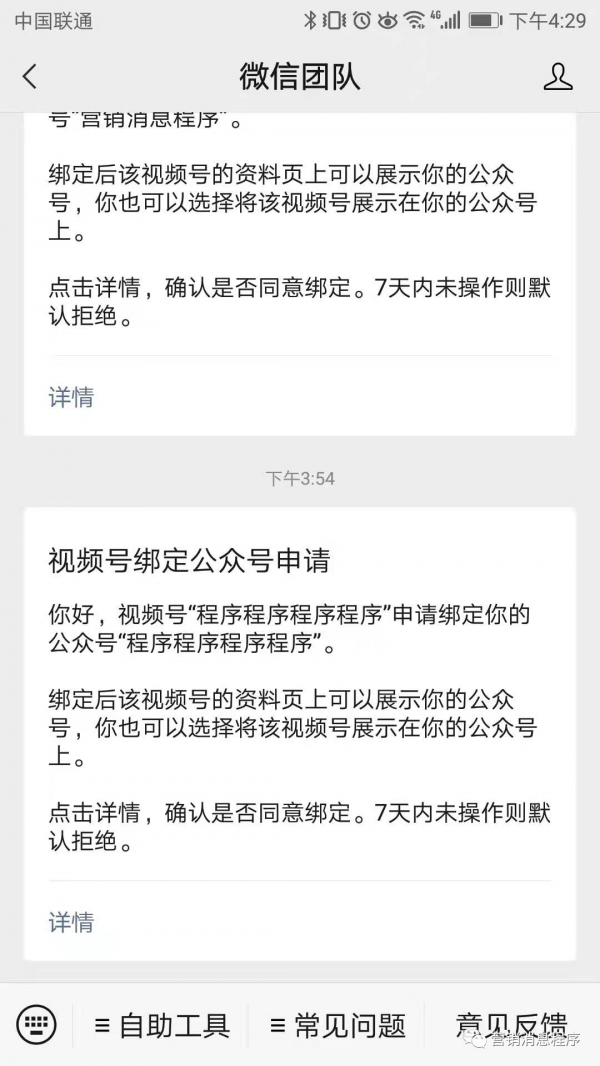 5 微信會下發(fā)綁定通知,公眾號管理員點(diǎn)擊頁面同意綁定即可。