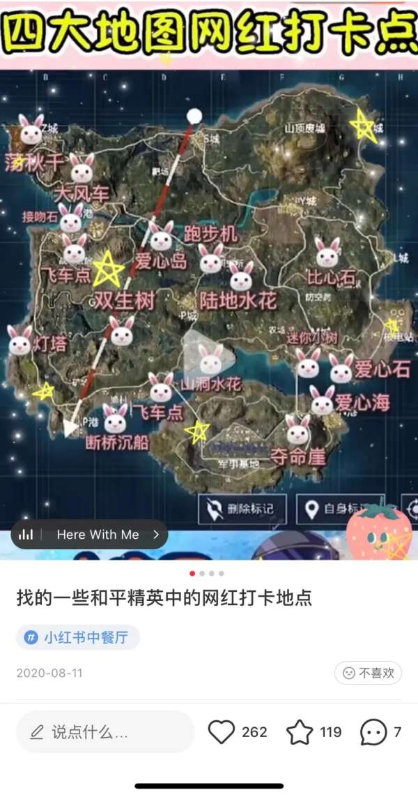 甚至在當(dāng)下流行的競技手游《和平精英》中,小紅書用戶們也能找到打卡景點(diǎn)。