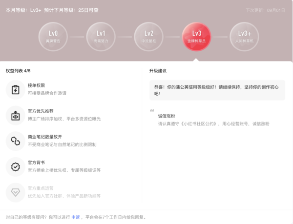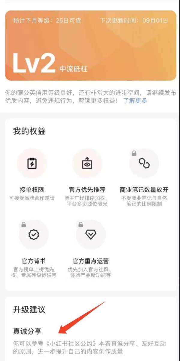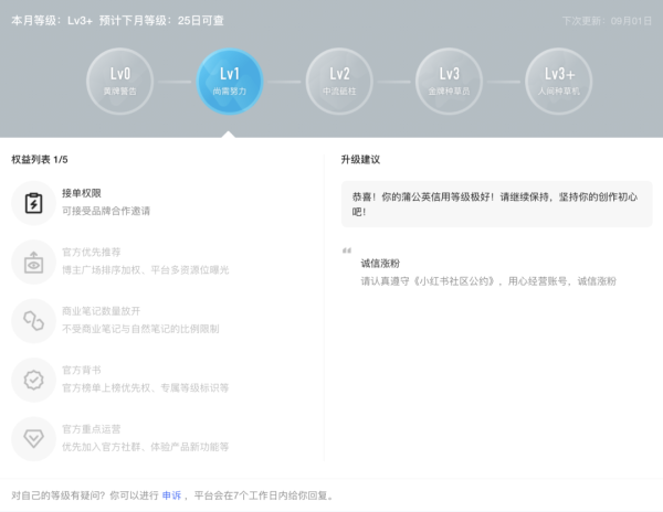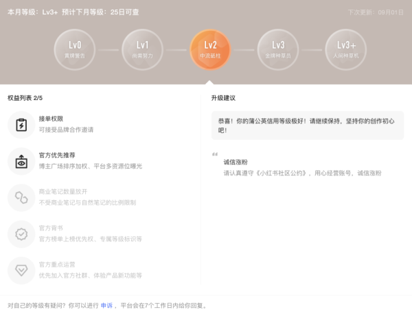 Lv2: 信用等級(jí)2的名稱為中流砥柱,而這個(gè)人群估計(jì)也確實(shí)是小紅書(shū)的中流砥柱了,可以接單,蒲公英平臺(tái)也會(huì)進(jìn)行推薦。