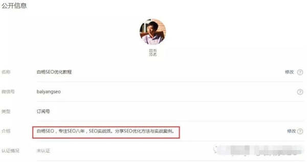 所以,公眾號就取名白楊SEO優(yōu)化教程,描述就寫了白楊SEO,專注SEO八年,SEO實(shí)戰(zhàn)派,分享SEO優(yōu)化方法和實(shí)戰(zhàn)案例?,F(xiàn)在不只是SEO了,所以描述也改更多了,看下面描述前后圖對比: