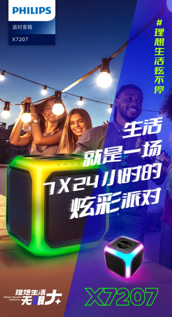 社交達人的動力源泉是澎湃音律和炫彩氛圍。飛利浦X7207派對音響,搭載獨特360度炫彩燈效和強勁音效,PartyLink無限串聯(lián),隨時隨地移步繽紛舞池,化身主角,即興起舞。