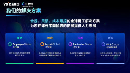 云生集團“出海易Chuhaiyi”為中國出海企業(yè)提供合規(guī)、靈活、成本可控的全球用工解決方案,打造了全球雇、全球薪、全球傭及全球增值服務四大核心板塊,精準覆蓋企業(yè)出海不同階段的核心需求,全方位解決企業(yè)海外招聘、雇傭、簽證辦理、靈活用工、薪酬福利管理等難題。