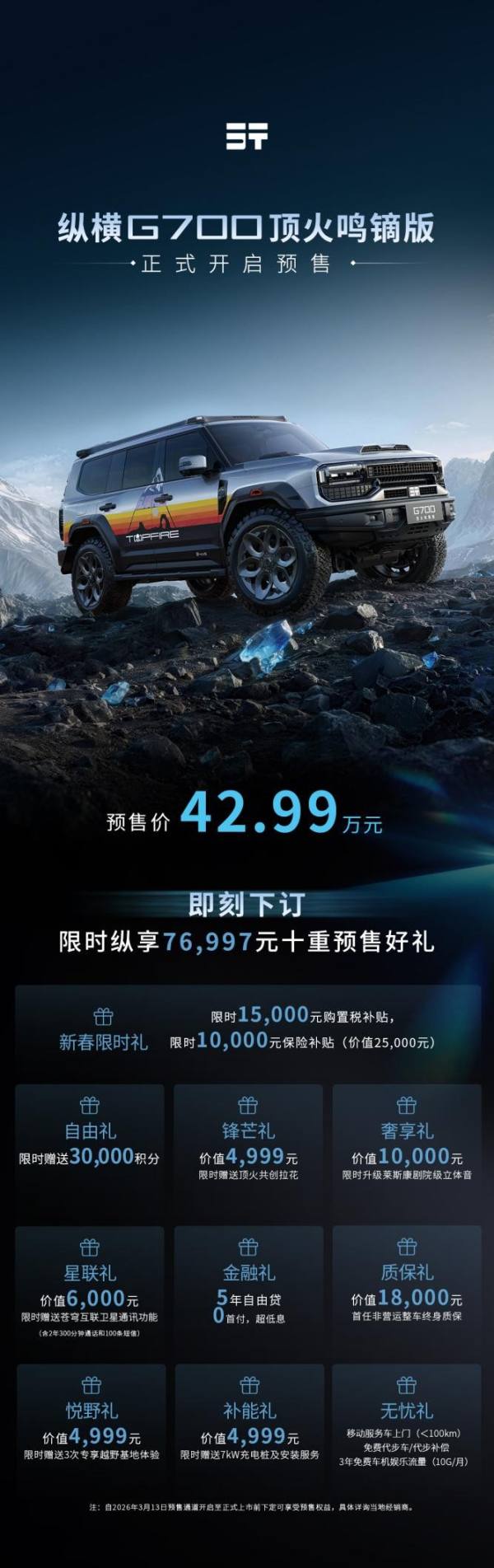 縱橫G700頂火鳴鏑版現(xiàn)已正式開啟預(yù)售,限時(shí)權(quán)益價(jià)42.99萬(wàn)元起。為回饋用戶,官方推出總價(jià)值76,997元的“十重豪禮”,涵蓋購(gòu)車補(bǔ)貼、用車保障及玩車體驗(yàn)全鏈路福利。權(quán)益內(nèi)容包括購(gòu)置稅與保險(xiǎn)補(bǔ)貼、專屬積分、終身質(zhì)保及越野基地體驗(yàn)等,全方位滿足用戶多元需求。目前,官方線上預(yù)訂通道已全面開放,所有權(quán)益支持實(shí)名鎖定,先到先得。