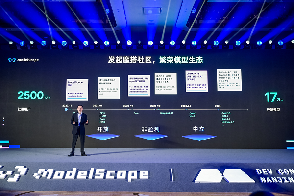 圖示 魔搭社區(qū)發(fā)起人、阿里云CTO周靖人在大會(huì)現(xiàn)場(chǎng)