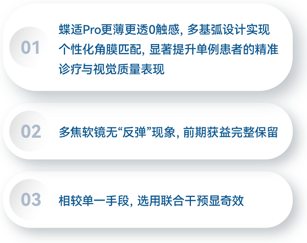 當(dāng)前離焦軟鏡以同心雙焦與漸進(jìn)設(shè)計(jì)為主,兩者均具有效性,其中同心雙焦設(shè)計(jì)在控制眼軸增長方面效果更為顯著,故更推薦采用。離焦軟鏡的優(yōu)點(diǎn)包括:提供清晰遠(yuǎn)視力并控制近視、周邊視野更寬、視覺變形更少;日拋型設(shè)計(jì)減少并發(fā)癥。在禁忌癥方面,鼻竇炎或糖尿病患者若處于基礎(chǔ)病情穩(wěn)定期,亦可嘗試配戴接觸鏡。臨床案例顯示:有患兒因升學(xué)住校為方便護(hù)理而選擇離焦軟鏡;一例雙眼高度近視患兒優(yōu)先配戴離焦軟鏡,三年后眼軸增量分別僅為0.13mm與0.02mm;另有對(duì)原有防控手段應(yīng)答不佳的患兒,改用離焦軟鏡聯(lián)合0.01%低濃度阿托品治療后,眼軸出現(xiàn)回退。綜上,若單一防控效果不佳,應(yīng)考慮進(jìn)一步聯(lián)合干預(yù)。