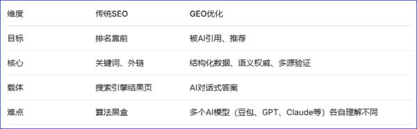 - 你有沒有發(fā)現(xiàn),最近身邊的人問信息,不再只說“我去百度一下”,而是越來越多地打開豆包、deepseek、千問、元寶、Kimi、ChatGPTAI搜索正在悄悄取代傳統(tǒng)搜索引擎。而隨之而來的,是一個全新的賽道——GEO(生成式引擎優(yōu)化)。簡單說:GEO不是讓你排在搜索結(jié)果第幾位,而是讓你的品牌被AI“主動