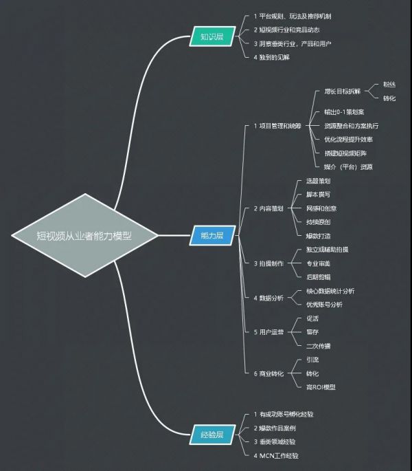 目前各行各業(yè)面臨流量增長獲客難題,短視頻作為日活僅次于微信的內(nèi)容營銷新渠道,正在日漸受到企業(yè)重視。那么,短視頻從業(yè)者需要具備什么樣的能力?在既往工作經(jīng)驗的基礎(chǔ)上,翻閱了一些招聘JD,總結(jié)出了一份<短視頻從業(yè)者能力模型> (下圖)。