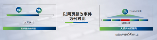 以網(wǎng)頁篡改為例:40%的篡改事件發(fā)生在凌晨1:00-6:00,70%的篡改事件都是被通報之后才發(fā)現(xiàn),80%的篡改事件,從事件發(fā)生到最終處置完畢,超過30天時間!而如果采用人機共智驅動的服務的話,就能做到對網(wǎng)頁篡改事件的7*24H監(jiān)測,一經發(fā)現(xiàn),即刻處置。整個處置效率會比傳統(tǒng)方式提升50倍以上。