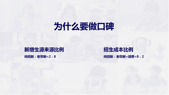 雖然少兒創(chuàng)客教育行業(yè)目前面臨著巨大的挑戰(zhàn),但是同時(shí)也存在著很大的機(jī)會(huì)。徐靖林分享其觀點(diǎn)“校長(zhǎng)、機(jī)構(gòu)的核心工作精力應(yīng)當(dāng)放在做好老帶新和續(xù)費(fèi)上,也就是我們所說(shuō)的口碑”。何謂口碑?徐靖林分享了一條口碑計(jì)算公式:口碑=口碑的建立(帶來(lái)續(xù)費(fèi))+口碑的傳播(帶來(lái)老帶新),對(duì)于機(jī)構(gòu)而言,口碑的建立基礎(chǔ)是讓家長(zhǎng)認(rèn)同我們的教學(xué)理念、服務(wù)、成果。徐靖林認(rèn)為,只有做好口碑,機(jī)構(gòu)才能實(shí)現(xiàn)低成本高速發(fā)展,不斷通過(guò)口碑為機(jī)構(gòu)勢(shì)能,推動(dòng)機(jī)構(gòu)快速發(fā)展,幫助機(jī)構(gòu)實(shí)現(xiàn)招生和續(xù)費(fèi)。