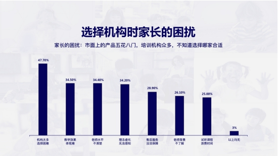 正是由于近幾年少兒創(chuàng)客教育的快速發(fā)展,很多機(jī)構(gòu)如雨后春筍紛紛成立,但是行業(yè)并未形成系統(tǒng)的服務(wù)體系,導(dǎo)致很多機(jī)構(gòu)成立但是質(zhì)量卻存在巨大差別。這也導(dǎo)致了家長(zhǎng)選擇機(jī)構(gòu)時(shí)充滿了困擾,鯨相冊(cè)合伙人徐靖林通過(guò)一組數(shù)據(jù)分析了家長(zhǎng)選擇機(jī)構(gòu)時(shí)的幾大困擾: