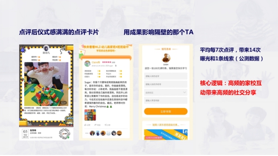 目前,機(jī)構(gòu)老帶新主要是源于家長(zhǎng)轉(zhuǎn)發(fā)機(jī)構(gòu)的招生海報(bào)等內(nèi)容,但是招生海報(bào)由于具備特別強(qiáng)的廣告屬性,家長(zhǎng)普遍認(rèn)為轉(zhuǎn)發(fā)會(huì)影響其朋友圈質(zhì)量,所以都不愿意轉(zhuǎn)發(fā)。與此同時(shí),家長(zhǎng)往往特別愿意分享自己孩子的學(xué)習(xí)成果,希望得到朋友的點(diǎn)贊。針對(duì)這個(gè)現(xiàn)象,鯨相冊(cè)通過(guò)產(chǎn)品化,研發(fā)充滿儀式感的點(diǎn)評(píng)卡片,老師的每一次點(diǎn)評(píng)都能夠生成一張精美的點(diǎn)評(píng)卡片,老師可以將點(diǎn)評(píng)卡片轉(zhuǎn)發(fā)給家長(zhǎng),家長(zhǎng)收到卡片后自然很愿意分享。而鯨相冊(cè)帶有的營(yíng)銷二維碼,機(jī)構(gòu)可以設(shè)置免費(fèi)試聽(tīng)課等和機(jī)構(gòu)展示等,其他家長(zhǎng)識(shí)別二維碼進(jìn)來(lái)后,自然填寫(xiě)線索表單,從而實(shí)現(xiàn)家長(zhǎng)朋友圈轉(zhuǎn)介紹環(huán)節(jié)。