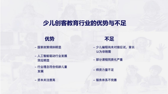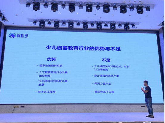 隨著教育和科技的快速發(fā)展,培養(yǎng)孩子的項(xiàng)目思維和創(chuàng)造力變得越來(lái)越重要,創(chuàng)客教育越來(lái)越受到社會(huì)和家庭的關(guān)注。與此同時(shí),少兒創(chuàng)客教育行業(yè)也面臨了巨大的挑戰(zhàn)。鯨相冊(cè)市場(chǎng)合伙人徐靖林分享了少兒創(chuàng)客教育行業(yè)的優(yōu)勢(shì)與不足,徐靖林主要從“國(guó)家政策”、“科技推動(dòng)”、“行業(yè)理念”、“資本市場(chǎng)”四個(gè)角度分析了目前少兒創(chuàng)科技教育行業(yè)的優(yōu)勢(shì)。但同時(shí),行業(yè)仍然存在著不足,主要表現(xiàn)在: