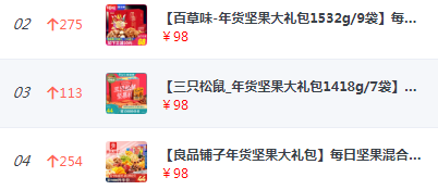 在12月的爆款排名中,有個引人注目的排名,就是2、3 、4名是價格都為98元的百草味、三只松鼠、良品鋪子的年貨堅果大禮包,這三款競品排名上升最多的是百草味,12月上升275名,銷量228.64萬件,位居月榜第二。