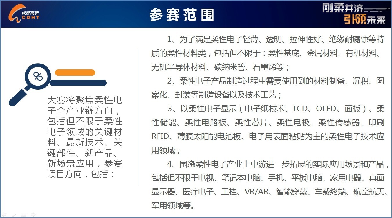2020年8月6日,由成都市經(jīng)濟和信息化局指導,成都高新技術(shù)產(chǎn)業(yè)開發(fā)區(qū)管理委員會主辦,成都高新區(qū)電子信息產(chǎn)業(yè)發(fā)展局承辦的第二屆成都柔性電子產(chǎn)業(yè)創(chuàng)新創(chuàng)業(yè)大賽(以下簡稱“大賽”)正式啟動,并開始在全國范圍內(nèi)征集優(yōu)秀的柔性電子產(chǎn)業(yè)項目參賽。