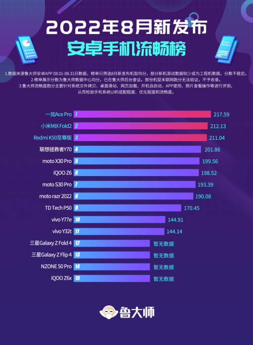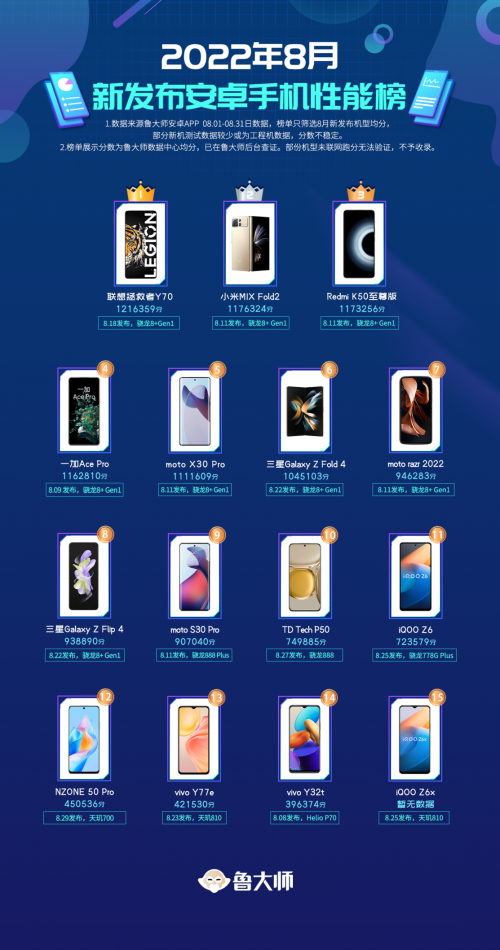 魯大師數(shù)據(jù)中心公布了8月安卓新發(fā)布手機(jī)性能、流暢度排行榜,數(shù)據(jù)來(lái)自魯大師APP 08.01日-08.31日的數(shù)據(jù),榜單只篩選在這期間新發(fā)布的機(jī)型。部分新機(jī)測(cè)試數(shù)據(jù)較少或?yàn)楣こ虣C(jī)數(shù)據(jù),分?jǐn)?shù)不穩(wěn)定。