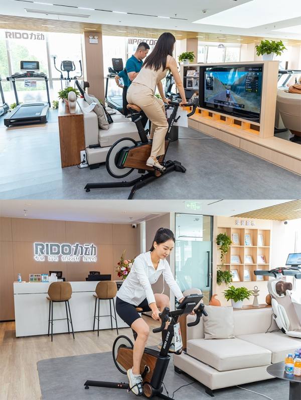 RIDO力動品牌CX50室內(nèi)公路車是店內(nèi)的另一亮點(diǎn),它采用了獨(dú)特的負(fù)坡度設(shè)計和實景騎行模式,支持大屏連接、在線競技、游戲沖關(guān),為健身愛好者帶來了更沉浸式、多樣化且充滿樂趣的鍛煉選擇。