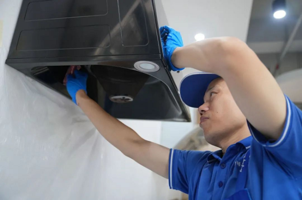 圖為輕喜服務(wù)者劉洋平在清洗油煙機(jī)
