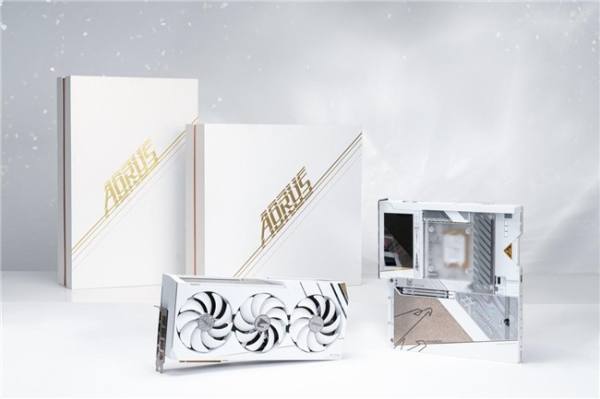 兩者整體的設(shè)計都以純白色為基礎(chǔ),輔以黃金色作為點綴,加入鈦金屬紋理裝飾面和半透明絢麗反光鏡面處理,在不同視角可以呈現(xiàn)多種不同的視覺效果。并且鈦金雕主板和顯卡上均鑲嵌了一塊黃金銘牌,全球限量300套,每一套上都有專屬的數(shù)字。技嘉準備的這套鈦金雕套裝銘牌編號為#028,028是成都的區(qū)號,而謝帝是CDC成都集團的代表性人物,這個編號對其來說帶有著特殊的含義。