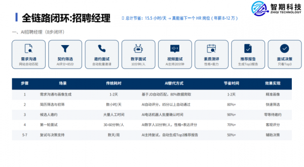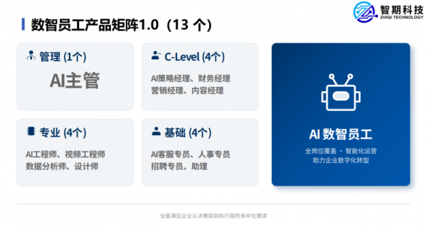平臺構建了覆蓋企業(yè)全崗位的 13 個數(shù)智員工產(chǎn)品矩陣,涵蓋決策層 4 大 C-Level 數(shù)智員工、專業(yè)層 4 類專業(yè)崗、基礎層 4 類基礎崗及管理層 AI 主管,實現(xiàn)從決策到執(zhí)行的全崗位智能化覆蓋,一站式滿足中小微企業(yè)全流程辦公需求。其中 AI 招聘經(jīng)理、AI 客服經(jīng)理等核心產(chǎn)品已實現(xiàn)全鏈路閉環(huán)運營,AI 招聘經(jīng)理 8 步全流程替代人工,單日省 15.5 小時人工時間,年省 HR 崗位成本 8-12 萬;AI 客服經(jīng)理 6 步閉環(huán)全自動化服務,實現(xiàn)秒級響應且 24 小時在線,年省成本 5-8 萬,大幅提升客戶體驗與留存率。