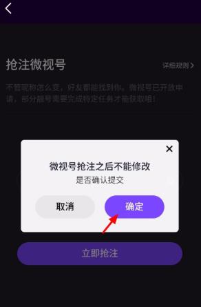第三步,搶注微視號(hào),輸入 微視號(hào),點(diǎn)擊 立即搶注;彈出提交提醒,點(diǎn)擊 確定;